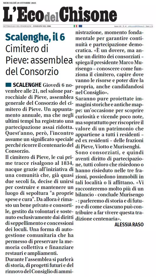 Descrizione L'Eco del Chisone di mercoledì 29 ottobre 2025 🗞 📍Scalenghese premiato al "Chiara Giovani 2025" 📍Cimitero di Pieve: assemblea del consorzio