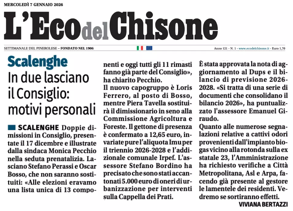 Descrizione L'Eco del Chisone di Mercoledì 7 gennaio 2025 - In due lasciano il Consiglio: motivi personali