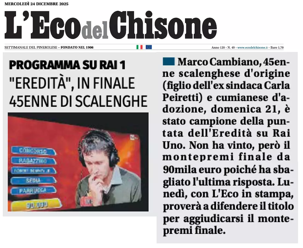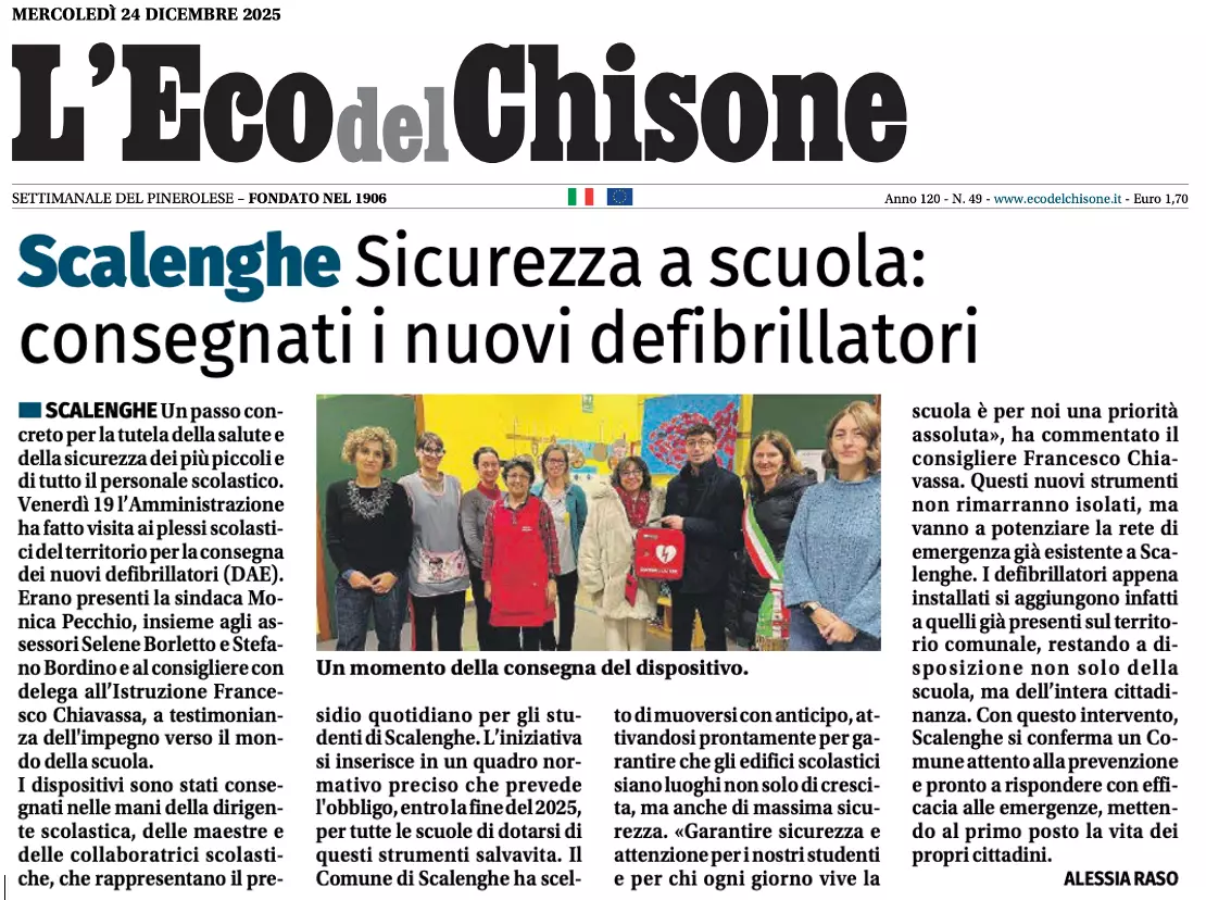 Descrizione L'Eco del Chisone di mercoledì 24 dicembre 2025 Sicurezza a scuola: consegnati i nuovi defibrillatori "eredità", in finale 45 di Scalenghe